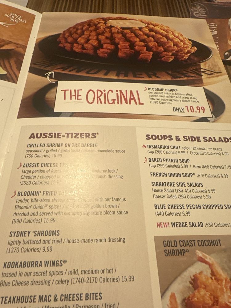 - Appetizers: Start with their signature Bloomin' Onion, an iconic crispy onion served with a spicy bloom sauce, or indulge in Kookaburra Wings for a savory kick.